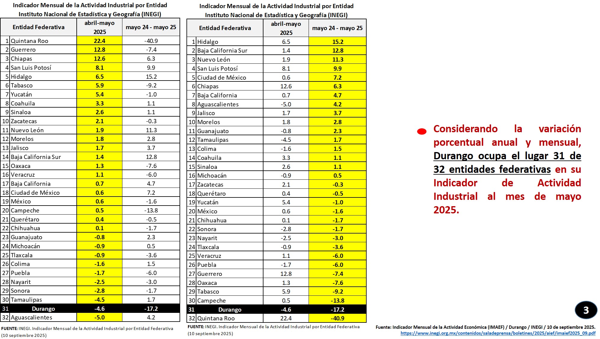 Con base en los datos presentados por el INEGI en su Indicador Mensual de la Actividad Industrial (IMAI) con fecha del 10 de septiembre de