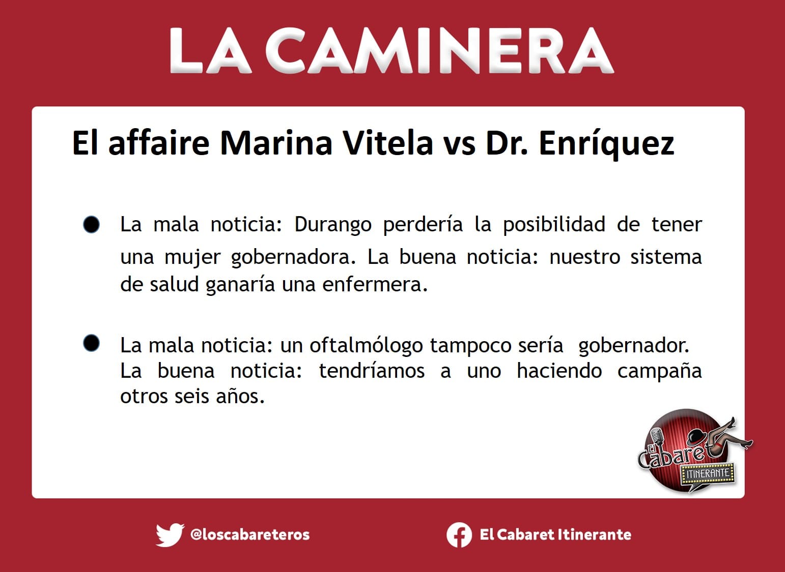 La mala noticia: Durango perdería la posibilidad de tener una mujer gobernadora. La buena noticia: nuestro sistema de salud ganaría una enfermera. La mala noticia: