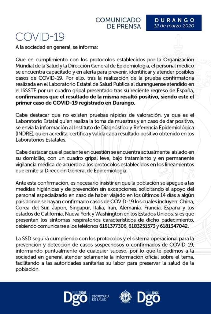 Se informó que el paciente fue enviado a su casa y tras practicársele la prueba confirmatoria en el Laboratorio Estatal de Salud Pública, se confirmó el primer caso de coronavirus COVID19 en Durango.